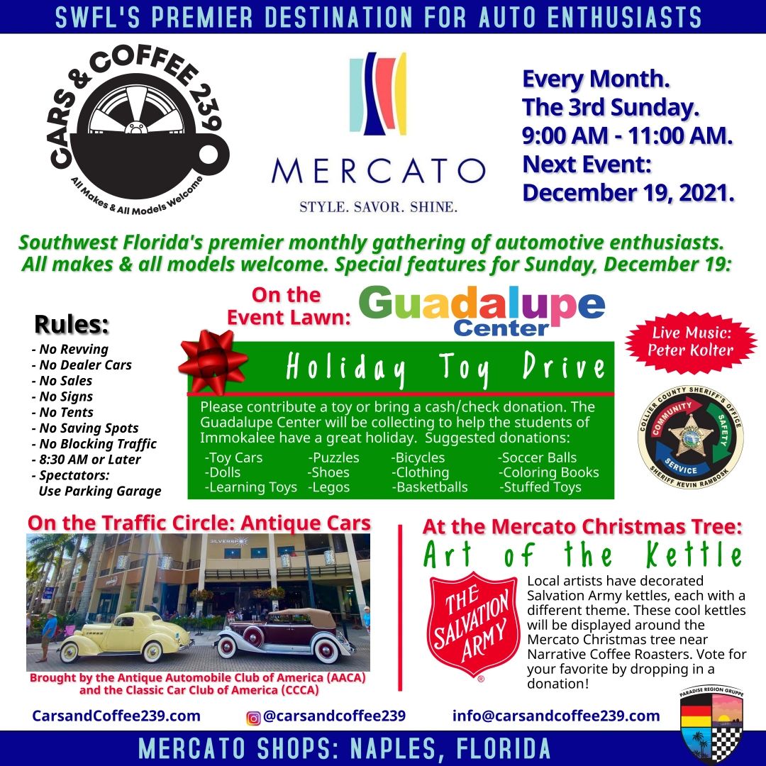 Bring your car and join us for Southwest Floridas premiere Cars and Coffee event. Southwest Floridas most diverse gathering of automotive enthusiasts. December 19 2021 Monthly on day 19 of the month 900 am.